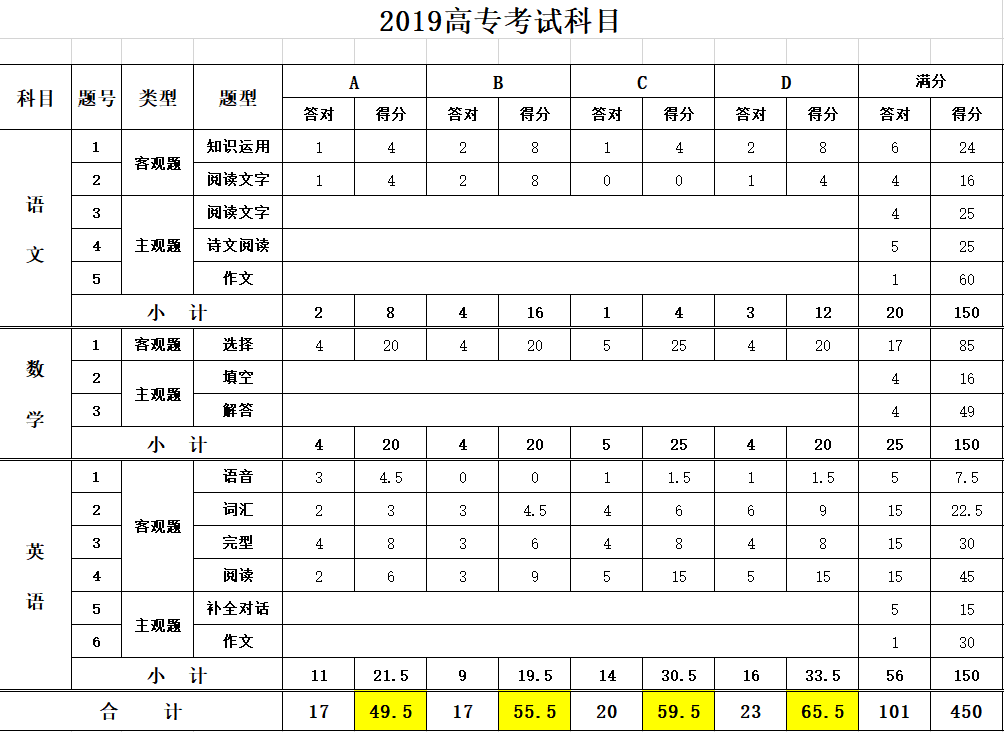 空格语文、数学、英语,单科总分150分,三门课合计450分。2019年文史类录取分数线114分,理工类录取分数线100分。超过25周岁的考生还有20分加分。也就是总分考到100就可以过关。接下来我们来分析下,如何通过“科学”的方法,轻松拿到100分。 空格首先看下各科考试的题目构成。语文选择题占40分,数学选择题占85分,英语选择题占105分。选择题相对于主观题更好拿分,必须全部达满,不留空。 |