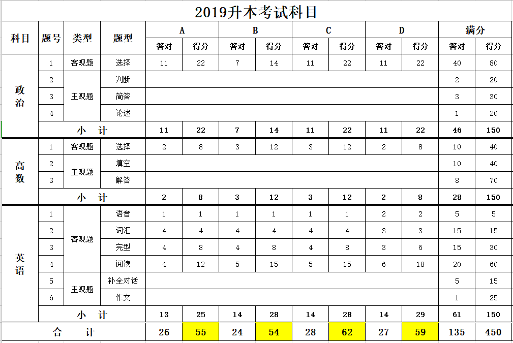 空格政治、高数、英语,单科总分150分,三门课合计450分。2019年经管类录取分数线109分,理工类录取分数线120分。年满25周岁的考生有20分加分,经管类考生按照去年的分数,考到90分就能进入专升本学习。我们来看如何轻松达到录取分数线。 |