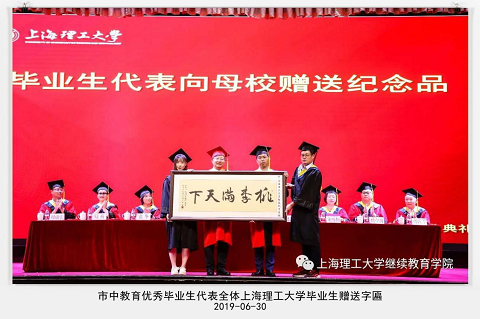 毕业生代表陈智贵、毕业生家属代表石清磊、教学点代表朱咏梅、教师代表顾秋洁相继发言。市中教育优秀毕业生代表向上海理工大学赠送了“桃李满天下”的字匾,表达对母校的深深祝福。